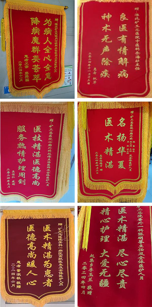 一面、兩面、三面錦旗(表揚(yáng)信)受贈數(shù)量不斷刷新著。一面面錦旗就如同一面面鏡子,它不僅代表一份褒獎、信任和贊許,更代表一份責(zé)任與激勵;是對醫(yī)護(hù)人員技術(shù)和服務(wù)的肯定,也是對礦醫(yī)人的激勵和鞭策;幢钡V工總醫(yī)院將繼續(xù)以專業(yè)的技術(shù)、優(yōu)質(zhì)的服務(wù)造福更多的患者。
