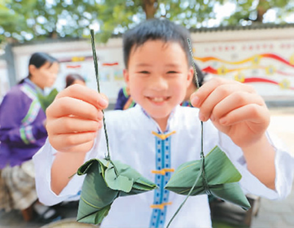 6月13日,江西省吉安市峽江縣金坪民族鄉(xiāng)新民村的小朋友展示包好的粽子。