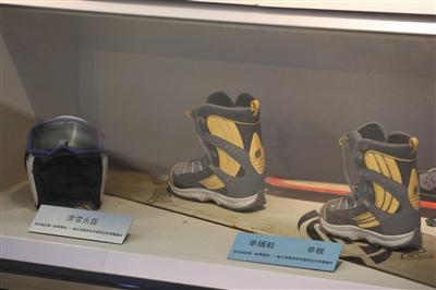 圖為崇禮冰雪博物館展品;╊^盔、單板鞋、單板均為華北地區(qū)第一家滑雪場——塞北滑雪場當年使用過的器械。