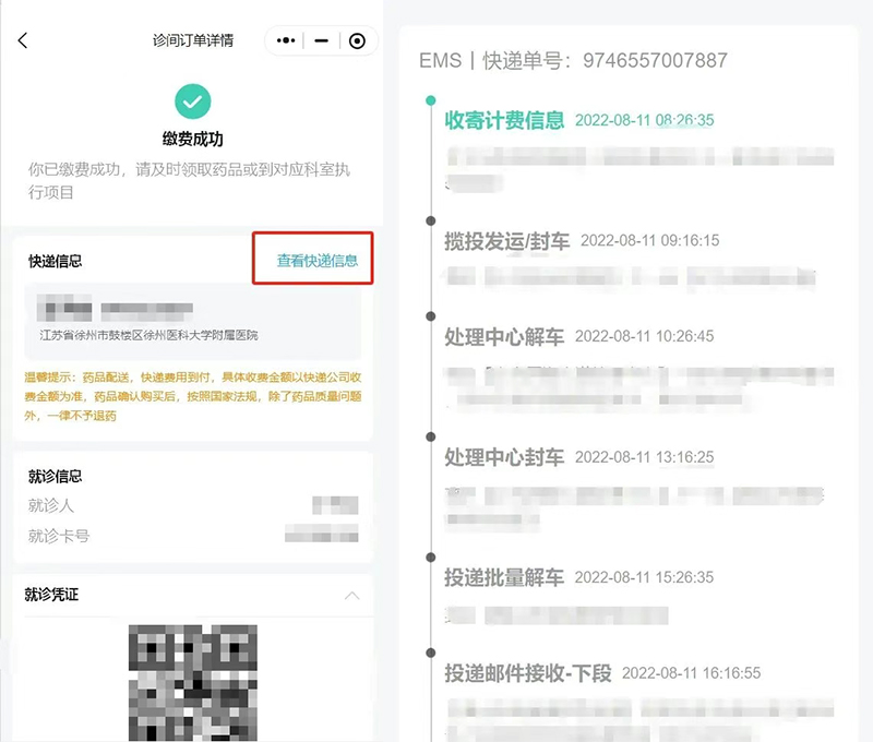 2. 在【繳費(fèi)詳情】中可查看處方支付明細(xì)。選擇任一藥品配送方式:來院自取或EMS物流配送。