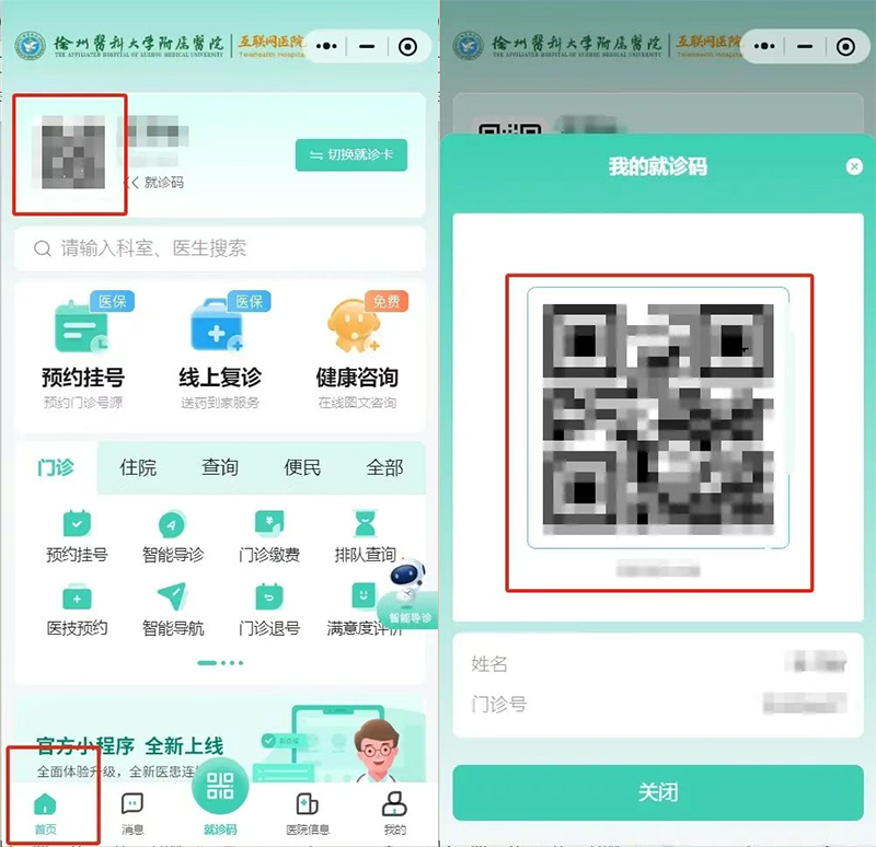 方式二:院內(nèi)自取。點(diǎn)擊【首頁】姓名旁的二維碼【就診碼】,在門診一樓藥房憑碼進(jìn)行取藥。