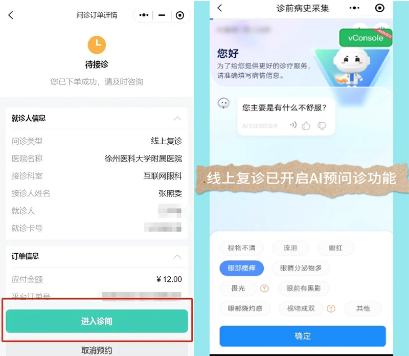 5. 支付完成后,點(diǎn)擊【進(jìn)入診間】,等待醫(yī)生接診。線上復(fù)診已開啟AI預(yù)問診功能,只需幾分鐘提前填寫癥狀,可以幫助醫(yī)生更快了解您的情況。