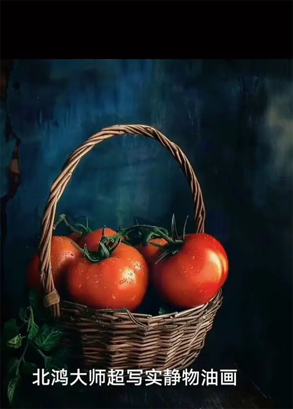 北鴻先生通過運(yùn)用空間和光影的安排,再通過精確的描繪,使物體的形態(tài)和質(zhì)感令人驚嘆地呈現(xiàn)在人們的眼前。明晰而結(jié)實(shí)的輪廓、單純而質(zhì)樸的光線、鮮明而實(shí)在的蘋果、葡萄、葉子、水珠,以及如實(shí)刻畫的蘋果上的斑點(diǎn)......他筆下將靜物作品描畫得更加具有立體感、更加豐富、逼真!