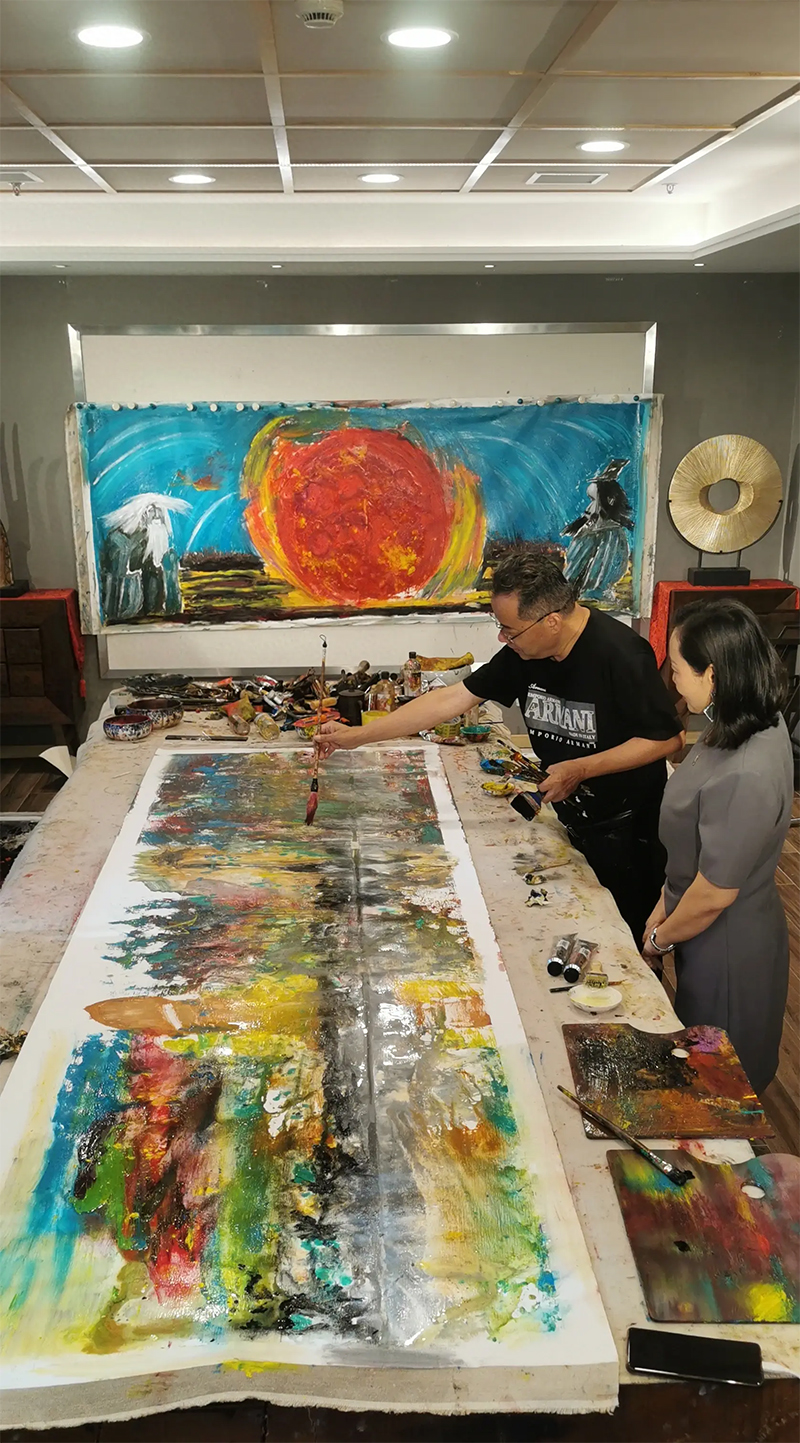 北鴻先生匠心獨運,揮灑巨幅“超印象”油畫《千里江山圖》,于畫布上編織著非凡的視覺盛宴。此作不僅是一幅畫,更是詩與夢的交響,引領觀者穿越至那超然物外的山水之境。