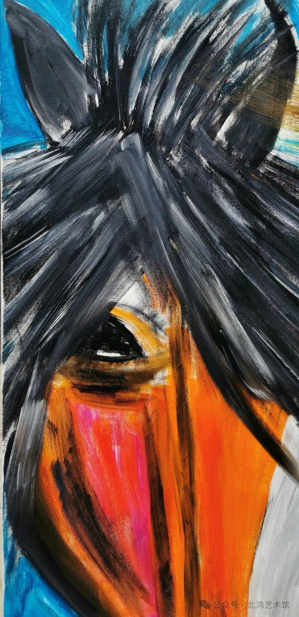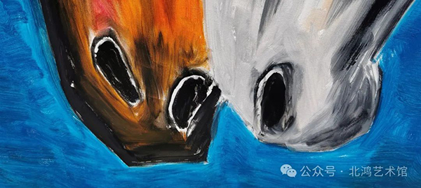 畫面聚焦兩匹馬頭特寫,成為這場邂逅的生動注腳。那匹橙紅色漸變的公馬,線條筆直而粗獷,色彩熱烈得如同彭城大地傍晚燃燒的絢爛霞光,搭配黑色鬃毛,似歲月沉淀的不羈墨色,帶著歷史的深沉與藝術(shù)的灑脫;灰白色的母馬,線條柔美且滿是曲線,清柔得宛如云龍山巔靜謐的皎潔月光,棕黃色漸變鬃毛則像金秋輕柔的麥浪,純凈又滿含生機(jī)。它們在天藍(lán)色背景的映襯下,似從不同時(shí)空奔赴而來,因藝術(shù)邂逅于這一方畫布。畫面整體色彩冷暖對比強(qiáng)烈,北鴻以近乎“色彩暴君”的肆意揮灑,承襲馬蒂斯的大膽與震撼,讓鮮明色彩碰撞出獨(dú)特藝術(shù)韻律,訴說著相遇的驚喜與交融的熾熱,天藍(lán)色背景寓意愛情美好,為這份邂逅添上意境深遠(yuǎn)的浪漫底色 。