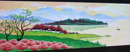 她在家鄉(xiāng)的土地上傳承創(chuàng)新,種植了300多畝木槿花,還有數(shù)十畝優(yōu)質(zhì)的桃樹林,與周圍40000畝桃園連成一片。旁邊就是“楊二郎擔(dān)山趕太陽”留下的一座踢球山,還有大片與駱馬湖相通的水面。