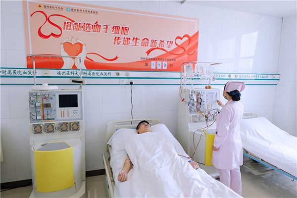 黃淮網(wǎng) 6月22日,在徐州醫(yī)科大學(xué)附屬醫(yī)院血液科病房,27歲的徐州醫(yī)科大學(xué)研究生徐杰正在進(jìn)行造血干細(xì)胞采集。他所捐獻(xiàn)的造血干細(xì)胞,將挽救一名身患白血病年輕女子的生命。