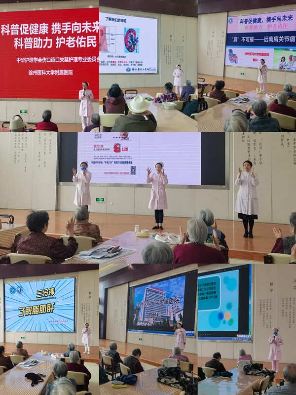 九如城康養(yǎng)中心云龍?jiān)菏且患壹t(yī)、康、養(yǎng)相融合的養(yǎng)老服務(wù)中心,高齡老人居多,部分老人長(zhǎng)期臥床不能自理。結(jié)合康養(yǎng)中心的特點(diǎn)和需求,徐醫(yī)附院?谱o(hù)士從專業(yè)角度向老人送上健康科普講座。泌尿外科護(hù)士長(zhǎng)王瓊講解老年尿失禁病人的護(hù)理管理;腎臟內(nèi)科護(hù)士長(zhǎng)劉穎通過(guò)生動(dòng)的圖畫與特色飲食模型,講解慢性腎臟病防治管理;骨科護(hù)士長(zhǎng)祝艷紅指導(dǎo)老人如何遠(yuǎn)離肩關(guān)節(jié)痛的困擾;神經(jīng)內(nèi)科護(hù)士長(zhǎng)拾丹丹、肖蓓和劉君君一起做了防治卒中的健康講座,現(xiàn)場(chǎng)指導(dǎo)老人學(xué)習(xí)健腦手指操;肝膽胰外科護(hù)士長(zhǎng)李靜簡(jiǎn)要講解了脂肪肝的成因和防治措施;肛腸科護(hù)士長(zhǎng)針對(duì)習(xí)慣性便秘的老人進(jìn)行健康指導(dǎo)。婦科護(hù)士長(zhǎng)王紅講解了如何預(yù)防宮頸癌。臺(tái)上臺(tái)下互動(dòng),現(xiàn)場(chǎng)氣氛非;钴S。