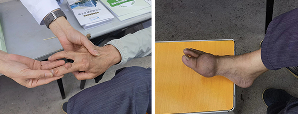 現(xiàn)場一位典型的慢性痛風(fēng)的病友,關(guān)節(jié)腫痛反復(fù)發(fā)作,病史已經(jīng)有20年余了,其中左足第一趾跖關(guān)節(jié)附近和左手第二掌指關(guān)節(jié)和近端指間關(guān)節(jié)伸側(cè)均出現(xiàn)了痛風(fēng)石,這樣的患者就需要積極科學(xué)的降尿酸治療,陳鵬主任中醫(yī)師講到,科學(xué)合理飲食和中西藥配合治療,將血尿酸的目標(biāo)300umol/l以下,只有這樣痛風(fēng)石才能慢慢溶解排出體外,除此之外還需要多飲水,科學(xué)控制體重。