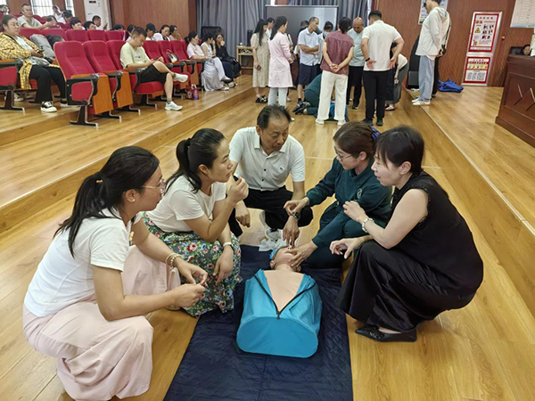培訓內(nèi)容緊密結(jié)合校園衛(wèi)生工作實際,分為“理論教學”與“實操演練”兩個核心環(huán)節(jié),旨在為學員們帶來既專業(yè)又實用的知識技能。理論教學部分,徐州醫(yī)科大學附屬醫(yī)院急診醫(yī)學科副主任醫(yī)師王吉慧同志擔任主講,憑借其豐富的臨床經(jīng)驗,用深入淺出的語言,重點講解了校園常見急癥的快速識別與初步處理流程、心肺復蘇(CPR)的理論知識以及傳染病防控要點。她的講解條理清晰、案例生動,為學員們夯實了堅實的理論基礎(chǔ)。實操演練環(huán)節(jié),徐醫(yī)附院急診與神經(jīng)內(nèi)外總支第四黨支部書記陳可同志帶領(lǐng)專業(yè)團隊進行演練現(xiàn)場,通過模擬真實場景,手把手教學員們?nèi)绾芜M行高質(zhì)量的心肺復蘇、正確使用自動體外除顫儀(AED)以及常用急救包扎技術(shù)。學員們學習熱情高漲,紛紛上前動手練習。團隊則在一旁耐心糾正動作、解答疑問,確保了每位學員都能聽得懂、學得會、用得上的效果。