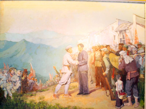 2003年,鐘鑫在徐州濱湖公園臨時畫廊內(nèi)的一角,有幸發(fā)現(xiàn)堆在一起的20多幅文革油畫作品。雖然這批油畫破爛不堪,也沒有畫家的題款,但是這一批作品的藝術(shù)水準(zhǔn)很高,一看就是老作品、好作品。他迫不及待的買下了這批油畫,當(dāng)時內(nèi)心非常忐忑,被這批油畫折騰的每天睡眠都不是很好,也不知道是悲是喜。他托畫家劉克寧把油畫照片拿給《毛主席去安源》的作者劉春華老師看。按照他的提議跑到廣州、海南找高虹老師、找羅工柳的女兒幫助尋找線索、查找畫家。四年多的時間,走訪了油畫界名流上百人,花去費用好幾十萬。終于在2008年通過徐州展覽館的老館長和書畫界的朋友,找到了這批油畫主創(chuàng)油畫家魏魯寧老師(江蘇省美協(xié)理事、江蘇省油畫協(xié)會理事、第八屆全國美展江蘇省評委、徐州市美協(xié)常務(wù)副主席),同時也找到了油畫《第一次黨代會》《毛主席視察云龍山》的畫家——著名美術(shù)教育家李玉義老師,并且到南京拜訪了江蘇省文化廳副廳長江蘇省國畫院院長趙緒成和從徐州調(diào)南師大教授方冰山、虞建、江蘇畫刊李建國,以及《淮北戰(zhàn)役決戰(zhàn)前夜》、《西柏坡》的作者——當(dāng)年任徐州文化館館長的賀成老師。(全國美展江蘇省評委、江蘇美協(xié)理事、江蘇省畫院任務(wù)創(chuàng)研室主任)。