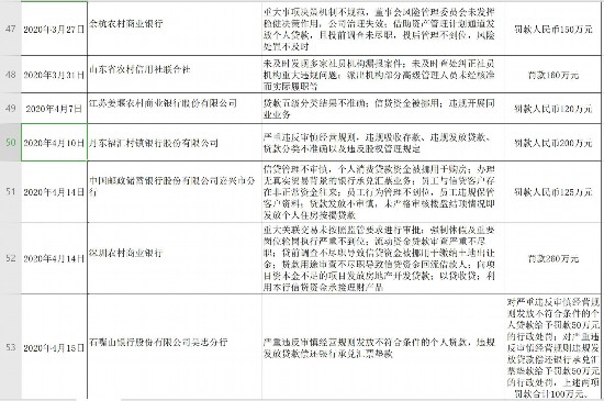 圖為銀保監(jiān)會(huì)網(wǎng)站公布的2020年1月1日至4月20日,處罰金額在100萬(wàn)元以上的銀行機(jī)構(gòu)。(杜燕飛、歐陽(yáng)易佳、劉卿整理)