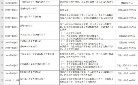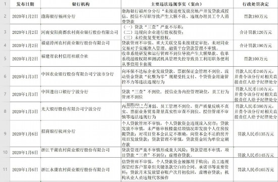 記者梳理發(fā)現(xiàn),相關(guān)違法違規(guī)涉及“個(gè)人貸款資金違規(guī)進(jìn)入房地產(chǎn)市場(chǎng)”“貸款資金變相支付土地出讓金”“房地產(chǎn)開(kāi)發(fā)貸款發(fā)放不審慎”“個(gè)人經(jīng)營(yíng)性貸款被挪用于購(gòu)房”等。被處罰機(jī)構(gòu)涉及北京農(nóng)商銀行、招商銀行杭州分行、蘇州銀行、浙江青田農(nóng)村商業(yè)銀行、天津武清村鎮(zhèn)銀行、鹿城農(nóng)商銀行等。