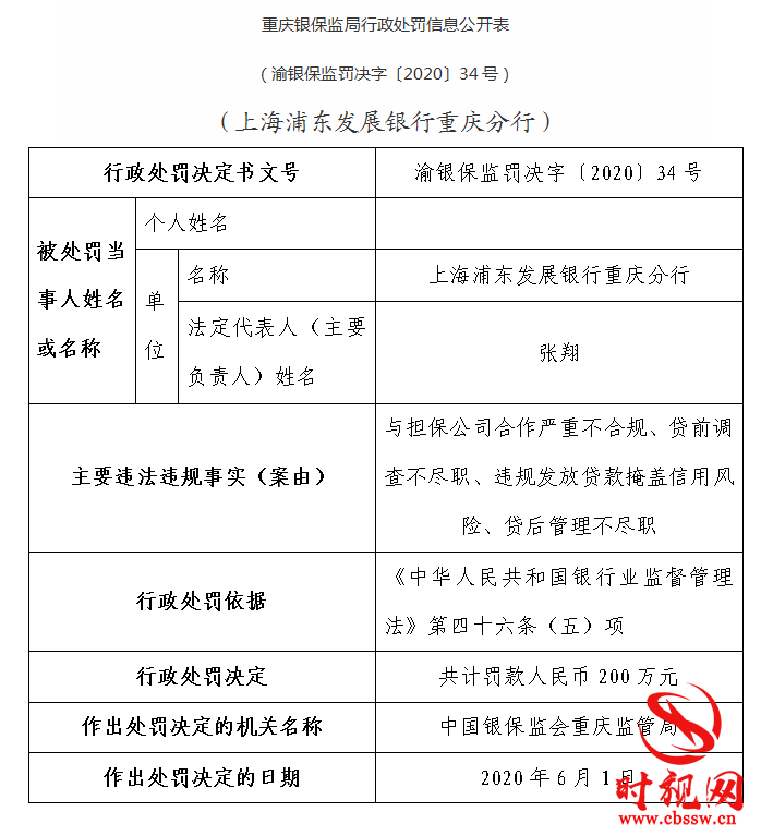 據銀保監(jiān)會網站6月10日消息,中國銀保監(jiān)會重慶監(jiān)管局公布行政處罰信息公開表顯示上海浦東發(fā)展銀行重慶分行因與擔保公司合作嚴重不合規(guī)、貸前調查不盡職、違規(guī)發(fā)放貸款掩蓋信用風險、貸后管理不盡職,違反了《中華人民共和國銀行業(yè)監(jiān)督管理法》第四十六條(五)項,罰款金額共200萬元。上述處罰決定作出的日期為6月1日。
