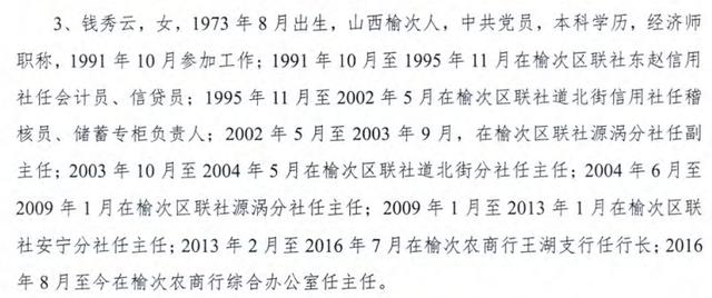 董事錢(qián)秀云,1973年8月出生,1991年10月參加工作,中共黨員,本科學(xué)歷,經(jīng)濟(jì)師。歷經(jīng)多個(gè)崗位,自2016年8月起任榆次農(nóng)商行綜合辦公室主任。
