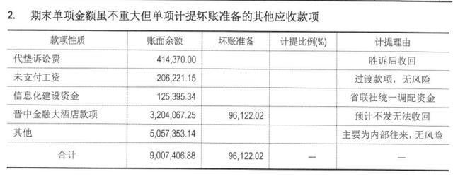 2019年報(bào)財(cái)務(wù)報(bào)表附注第33頁(yè),期末單項(xiàng)金額雖不重大但單項(xiàng)計(jì)提壞賬準(zhǔn)備的其他應(yīng)收款項(xiàng)之晉中金融大酒店款項(xiàng)賬面余額3204067.25元,壞賬準(zhǔn)備96122.02元,計(jì)提理由是預(yù)計(jì)不發(fā)無(wú)法收回。經(jīng)查驗(yàn)國(guó)家企業(yè)信用信息系統(tǒng),晉中金融大酒店不存在,疑似準(zhǔn)確名稱(chēng)為山西省晉中信用合作社培訓(xùn)中心榆次金融大酒店,該酒店曾因生產(chǎn)經(jīng)營(yíng)添加可能危害人體健康物質(zhì)的食品被處罰。