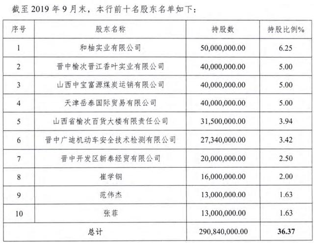 截至2019年12月末,該行法人股東12人,分別為:和柚實(shí)業(yè)有限公司(持股6.25%)、山西中寶富源煤炭運(yùn)銷(xiāo)有限公司(持股5.00%)、天津岳泰國(guó)際貿(mào)易有限公司(持股5.00%)、 晉中榆次晉江香葉實(shí)業(yè)有限公司(持股5.00%)、山西省榆次百貨大樓有限責(zé)任公司(持股3.94%)、晉中廣迪機(jī)動(dòng)車(chē)安全技術(shù)檢測(cè)有限公司(持股3.42%)、晉中開(kāi)發(fā)區(qū)新泰經(jīng)貿(mào)有限公司(持股2.50%)、山西金房子建業(yè)發(fā)展有限公司(持股1.25%)、晉中市永泰房地產(chǎn)開(kāi)發(fā)有限公司(持股1.25%)、山西中捷鋼結(jié)構(gòu)彩板有限公司(持股1.25%)、山西正能量文化傳媒有限公司(持股1.20%)、山西遠(yuǎn)征機(jī)電設(shè)備制造有限公司(持股1.01%)。
