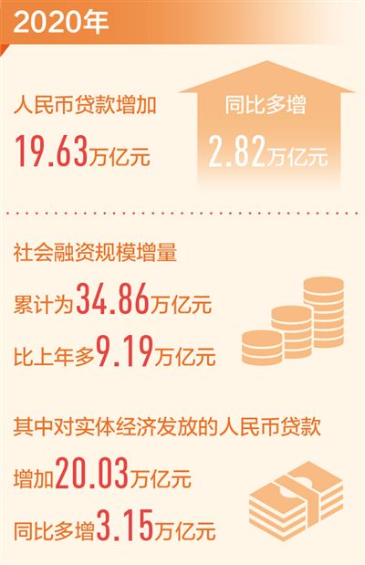 人民銀行發(fā)布的最新數(shù)據(jù)顯示,2020年,我國人民幣貸款增加19.63萬億元,同比多增2.82萬億元,社會融資規(guī)模增量累計為34.86萬億元,比上年多9.19萬億元,其中對實體經(jīng)濟發(fā)放的人民幣貸款增加20.03萬億元,同比多增3.15萬億元。源源不斷的金融活水,讓實體經(jīng)濟發(fā)展動力十足。