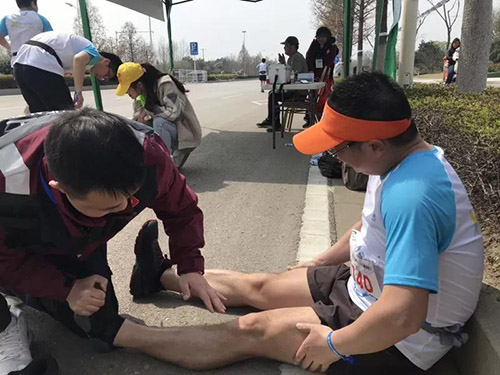 清晨5點(diǎn)半,由應(yīng)急辦朱勇主任帶領(lǐng)市腫瘤醫(yī)院20名隊(duì)員組成的緊急醫(yī)學(xué)救援隊(duì)統(tǒng)一著裝,攜帶必備的應(yīng)急保障藥品和器材,在醫(yī)院集結(jié)完畢。全體隊(duì)員6點(diǎn)半準(zhǔn)時(shí)到達(dá)了 “徐馬” 賽事指定的醫(yī)療救治站點(diǎn)——中后賽段(27公里~31.5公里處)。