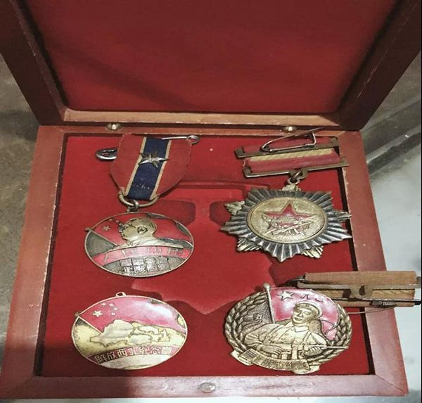 在我們?cè)偃?qǐng)求下,老人終于從柜櫥里取出一個(gè)絨布包裹的木匣,打開(kāi)之后,里面有六枚閃閃發(fā)光的獎(jiǎng)?wù)。我們凝視好久,也思索良久。它們,雖然不會(huì)言語(yǔ),但特殊的圖案,無(wú)不透視著戰(zhàn)爭(zhēng)的冷峻與殘酷,也折射出一個(gè)老兵將生死置之度外的壯志豪情!