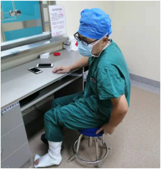 10點(diǎn)多,第一臺(tái)手術(shù)結(jié)束,張?jiān)蕰?huì)坐下,放下一直墊在抬腳凳上的傷腳,休息一會(huì)。他扶著凳有點(diǎn)疲憊的樣子被一位同事悄悄拍下,發(fā)到了工作群里。大家“炸了”,一位手術(shù)室護(hù)士點(diǎn)贊:今天看到張醫(yī)生受傷了,自己走路都很困難,還在手術(shù)!