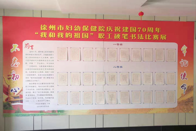 金秋十月,是中華人民共和國(guó)成立70周年大慶的日子,正值徐州市婦幼保健院職工深入貫徹落黨的十九大精神,踐行習(xí)近平新時(shí)代中國(guó)特色社會(huì)主義思想,開展“不忘初心,牢記使命”主題教育。為歌頌新中國(guó)成立以來(lái)黨和國(guó)家的歷史巨變和輝煌成就,弘揚(yáng)愛國(guó)主義精神,激發(fā)廣大職工的愛國(guó)情懷,徐州市婦幼保健院舉辦了慶祝新中國(guó)成立70周年“我和我的祖國(guó)”職工硬筆書法比賽展,有80名職工硬筆書法作品入選展覽。