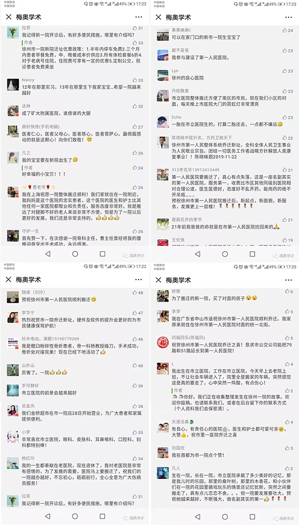 消息發(fā)布5個多小時,微信的閱讀量達到2.7萬,到23日下午16:50分,閱讀量已超過4萬、后臺留言上千條。這些人中,有正在忙碌搬遷的醫(yī)院醫(yī)護人員,有受過關懷的患者及家屬,有參加新一院建設的工人,有遠在外鄉(xiāng)的徐州人,還有同行們的遙遠祝賀。