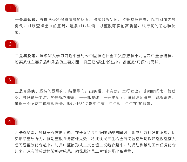 焦慧玲仔細聽取街道黨委班子全體成員發(fā)言后表示,大家面對問題時,不回避、不遮掩,自我剖析和相互批評精準到位,對待問題直言不諱,真正達到了“紅臉出汗”“排毒治病”的效果,提升了黨委的凝聚力和戰(zhàn)斗力。同時她要求,
