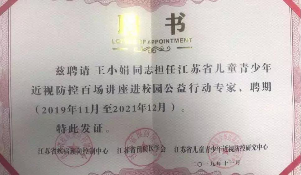 王小娟 江蘇省兒童青少年近視防控百場講座進校園公益行動專家~