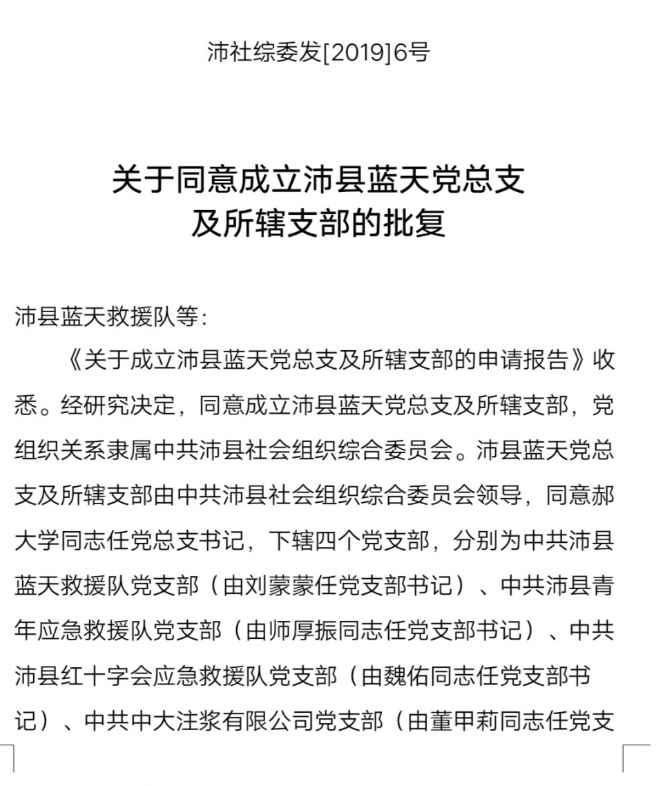 批復(fù)文件指出,沛縣藍(lán)天黨總支及所轄支部,黨組織關(guān)系隸屬中共沛縣社會(huì)組織綜合委員會(huì)。沛縣藍(lán)天黨總支及所轄支部由中共沛縣社會(huì)組織綜合委員會(huì)領(lǐng)導(dǎo),郝大學(xué)同志任黨總支書記,下轄四個(gè)黨支部,分別為中共沛縣藍(lán)天救援隊(duì)黨支部(由劉蒙蒙任黨支部書記)、中共沛縣青年應(yīng)急救援隊(duì)黨支部(由師厚振任黨支部書記)、中共沛縣紅十字會(huì)應(yīng)急救援隊(duì)黨支部(由魏佑任黨支部書記)、中共中大注漿有限公司黨支部(由董甲莉任黨支部書記)。