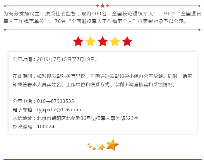 為表彰先進、弘揚正氣,展示廣大退役軍人不忘初心、永葆本色、勇于奮斗的時代風采,激勵退役軍人管理保障機構(gòu)及干部職工擔當作為、奮勇爭先,今年在全國范圍內(nèi)開展全國模范退役軍人、全國退役軍人工作模范單位及個人評選表彰活動。按照工作要求,各省(自治區(qū)、直轄市)、軍地有關(guān)部門采取自下而上、上下結(jié)合的辦法,經(jīng)認真遴選、深入考察,研究提出了推薦對象。評選表彰領(lǐng)導小組差額評選,研究確定了擬表彰對象。