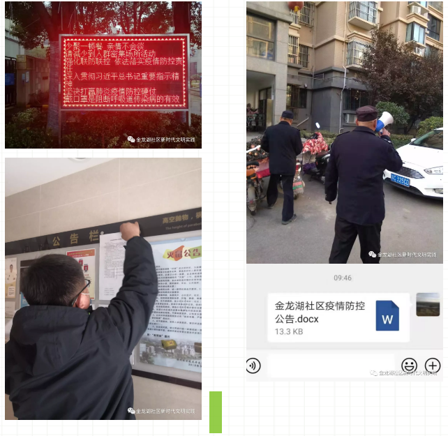 通過(guò)LED屏、小區(qū)微信群、張貼通知、發(fā)放宣傳彩頁(yè)等多種方式,加大對(duì)疫情防護(hù)知識(shí)的宣傳和普及力度,有針對(duì)性地做好公共場(chǎng)所、社區(qū)群眾的宣傳教育,告知有發(fā)熱,咳嗽,腹瀉,四肢乏力等癥狀的居民朋友,要積極聯(lián)系社區(qū)進(jìn)行登記。做到疫情防控人人知曉、人人參與。同時(shí)加強(qiáng)輿論引導(dǎo),敦促群眾不信謠、不傳謠、不造謠,從自身做起,配合社區(qū)全力做好疫情防控工作。