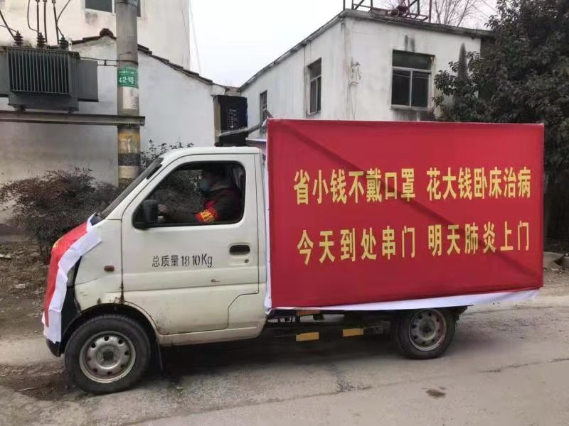 云龍區(qū)的退役軍人王坷駕駛著防疫流動(dòng)宣傳車穿梭在大郭莊街道上河頭社區(qū)的各個(gè)角落,為社區(qū)防疫助力。從年初二開始,王坷找來了一輛面包車,張貼了防疫標(biāo)語和音響,“省小錢不戴口罩,花大錢臥床治病”“今天到處串門,明天肺炎上門”。王坷每天從早上8點(diǎn)到晚上8點(diǎn)駕駛宣傳車在整個(gè)社區(qū)巡邏,提醒居民戴口罩、取消聚會(huì),大大減輕了社區(qū)工作人員的壓力。