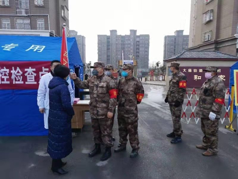 徐州經(jīng)開區(qū)官莊村,退役軍人在居民小區(qū)門口設(shè)置監(jiān)測(cè)點(diǎn)和隔離區(qū),對(duì)進(jìn)出車輛和人員進(jìn)行體溫監(jiān)測(cè)與登記。官莊支部書記吳世海說:養(yǎng)兵千日,用兵一時(shí),退役軍人的奉獻(xiàn)和付出得到居民的認(rèn)可和支持。