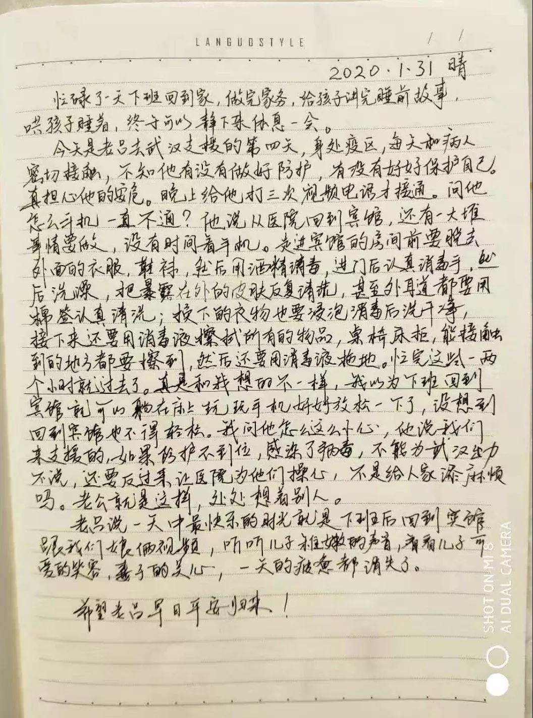呂成偉的愛(ài)人是徐州市第一人民醫(yī)院康復(fù)科的護(hù)士,從不記日記的她,在呂成偉開(kāi)展救援任務(wù)的的第一天寫了“處女作”日記。從日記中可以看得出她對(duì)呂成偉的牽掛、理解與支持。她在日記中寫道,每天呂成偉與很多患者密切接觸,不知他有沒(méi)有做好自我防護(hù),真擔(dān)心他的安危。有時(shí)候在他下班后給他打三、四個(gè)電話才能打通。原以為他下班后回到賓館會(huì)很放松,其實(shí)和她想的不一樣。呂成偉告訴愛(ài)人,每天從醫(yī)院回到賓館,他要用一、二個(gè)小時(shí)的時(shí)間去消毒、清洗當(dāng)天穿的衣物,洗澡,消毒他的住處的環(huán)境,做好自我防護(hù)。呂成偉說(shuō),在完成救援任務(wù)的同時(shí),做好自我防護(hù),是為了不給救援醫(yī)院添亂,即是對(duì)自己負(fù)責(zé),更是對(duì)救援任務(wù)負(fù)責(zé)。簡(jiǎn)單的一句話,其實(shí)是呂成偉對(duì)救援工作敬業(yè)的體現(xiàn)。工作中他總是兢兢業(yè)業(yè),刻苦鉆研業(yè)務(wù),處處以高標(biāo)準(zhǔn)、嚴(yán)要求自己,處處為他人著想。立足平凡的崗位默默奉獻(xiàn),用心靈溫暖心靈,用生命守護(hù)生命。