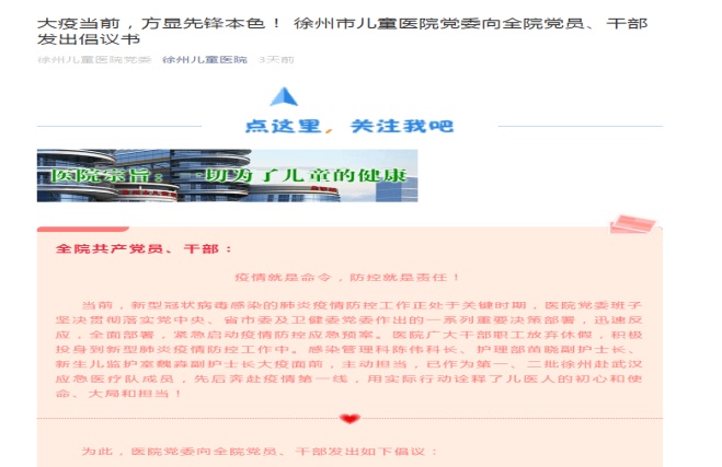當(dāng)前,新型冠狀病毒感染的肺炎疫情防控工作正處于關(guān)鍵時(shí)期,徐州市兒童醫(yī)院黨委班子堅(jiān)決貫徹落實(shí)黨中央、省市委及衛(wèi)健委黨委作出的一系列重要決策部署,迅速反應(yīng),全面部署,緊急啟動(dòng)疫情防控應(yīng)急預(yù)案。醫(yī)院廣大干部職工放棄休假,積極投身到新型肺炎疫情防控工作中。