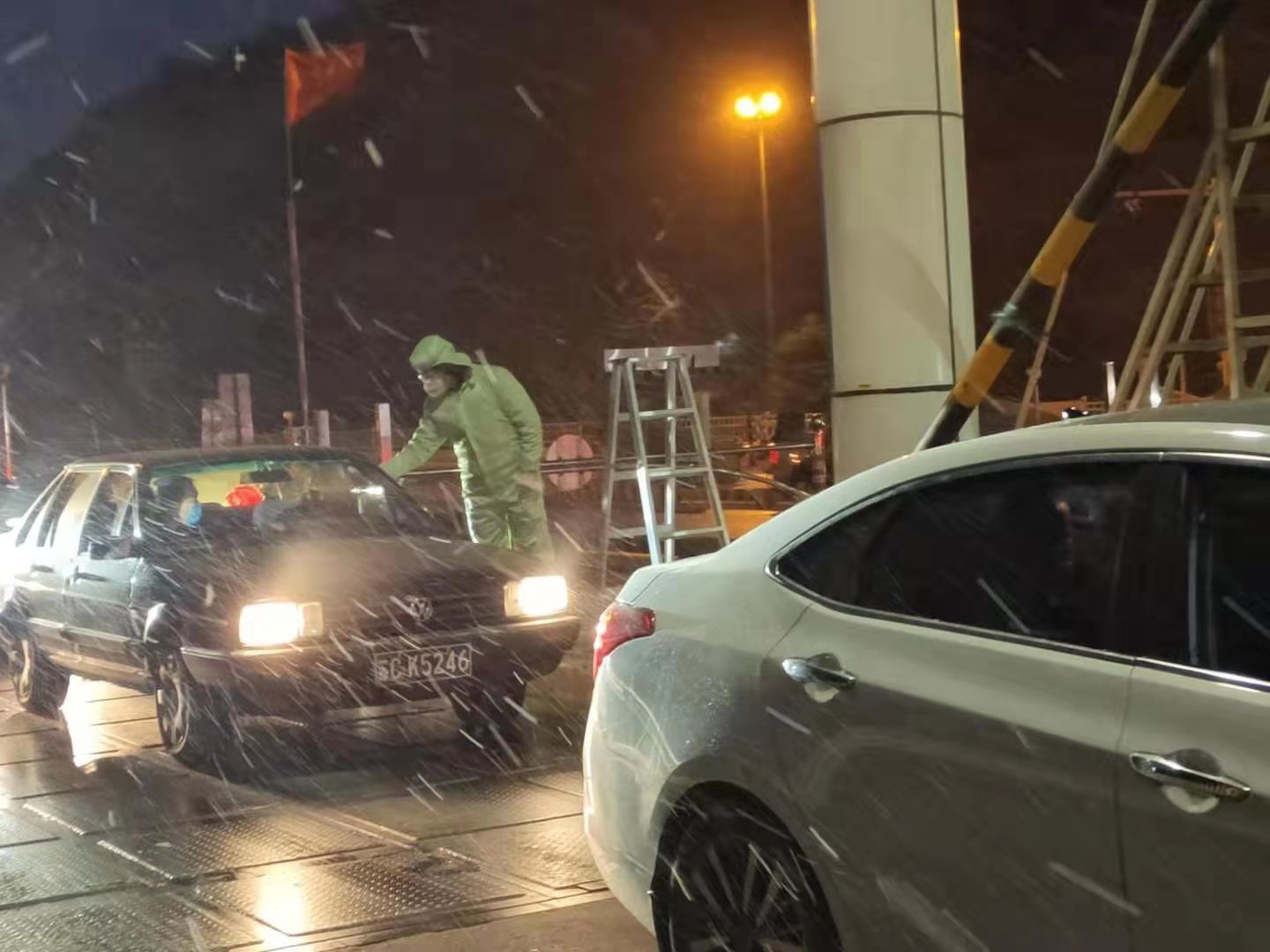 2月6日凌晨,徐州夜間的氣溫逐漸降低,寒風刺骨,一場降雪陡然來襲。為堅決打贏新型冠狀病毒感染的肺炎疫情防控阻擊戰(zhàn),守住徐州市區(qū)東大門,風雪中駐守在徐州東高速出口疫情防控檢查點的交通海事、公安交警等人員堅守崗位,對過往所有車輛的車主及乘客逐一進行體溫檢查并登記,從源頭進行管控,守護市民安全和健康。