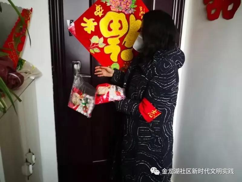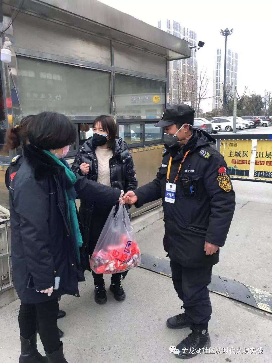金龍湖街道辦事處副主任朱艷梅、工作人員朱金星、金龍湖社區(qū)黨支部書記劉秀君慰問疫情防控工作人員。