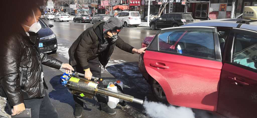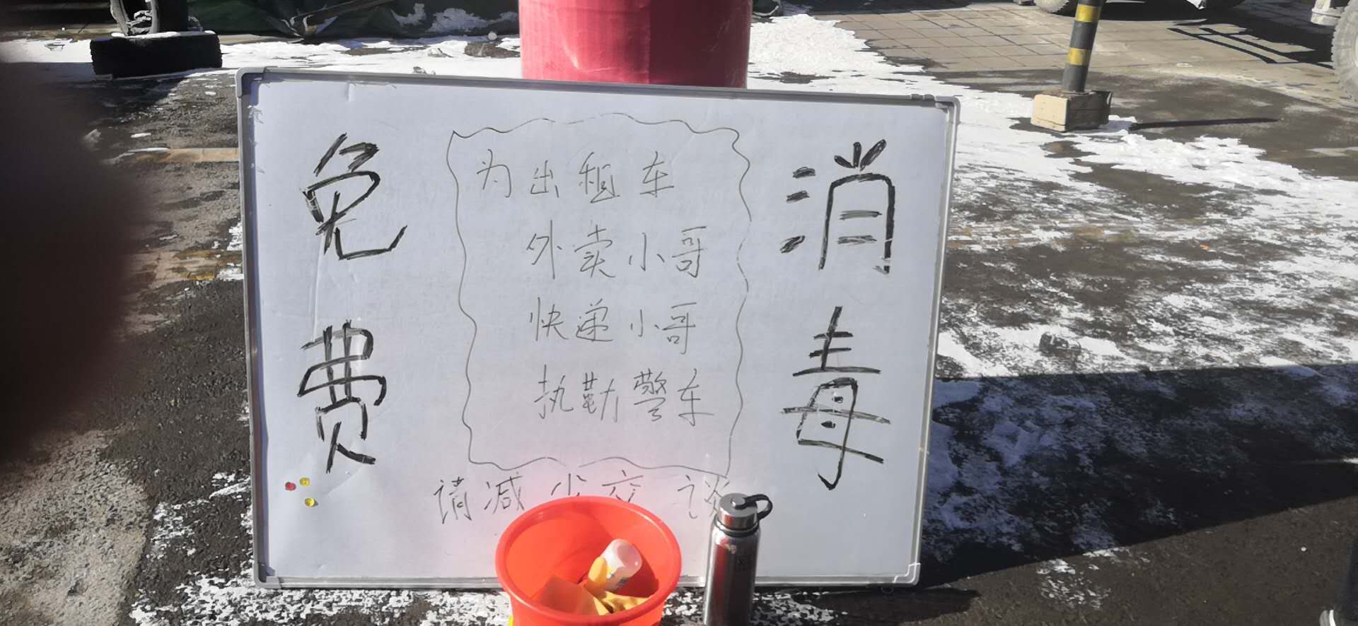 遼寧本溪市唐家路的一處人行道邊,天天立著這樣一個牌匾:免費(fèi)為出租車、外賣小哥、快遞小哥、執(zhí)勤警車消毒!最后還特別強(qiáng)調(diào)“請減少交談”字樣。這塊牌子立在人行道電線桿邊,遠(yuǎn)遠(yuǎn)就能看到。牌匾前還放著水桶、消毒液、塑膠手套和水杯,水桶旁邊放著一個勾兌好的84消毒液和一臺不銹鋼儀器,儀器前還站著一個身材魁梧帶著口罩的年輕小伙子。“哥們兒,麻煩幫我車消消毒,今早我出車,這幾天感謝你為我們出租車消毒!雖然我們自己也對車進(jìn)行消毒,可總歸沒你這儀器專業(yè),聽其他師傅說,你這消毒儀器上千元呢!”出租車司機(jī)白楊客氣地說道。