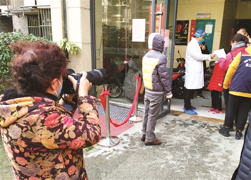 9時05分,該單元的武奶奶第一個出現(xiàn)在大家面前,額溫槍測量體溫為36.2℃?匆娛卦趩卧T口的街道和社區(qū)工作人員,老人一個勁地說:“謝謝你們了,辛苦你們了!”