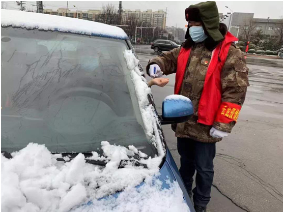 鏡頭六:邳州高新區(qū)退伍軍人志愿服務隊退役軍人段加強、魏寧、李竹峰、靳小州、沈陽、王剛、楊小林、周漢江、陳彪、張志軍等人在高新區(qū)果園橋卡口堅持雪中值班。