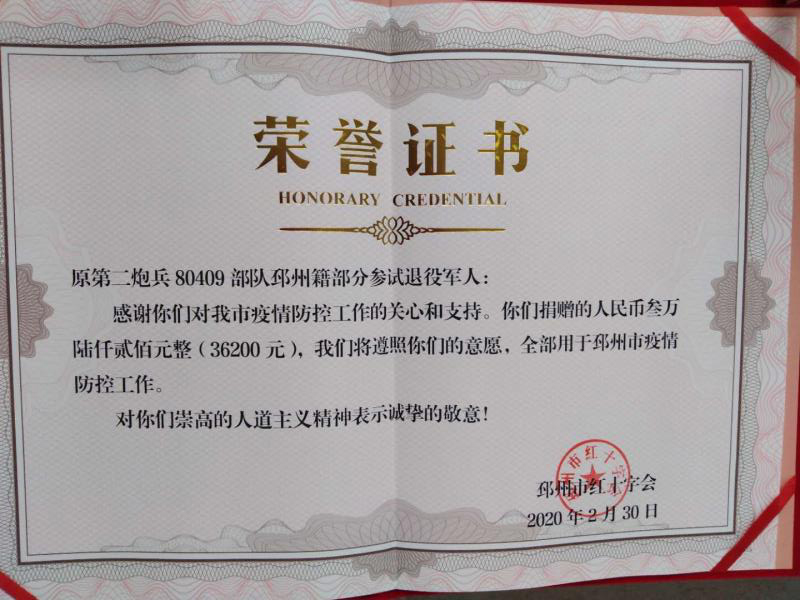 令人意外的是,三位老人不僅代表他們自己,而是代表了148位平均年齡65歲的退役老兵。在趕來紅十字會(huì)之前,百余位老人反復(fù)翻閱電話簿,用老年機(jī)與舊時(shí)戰(zhàn)友相互聯(lián)系、組織向抗疫活動(dòng)捐款。僅僅四天時(shí)間里,148位老人迅速響應(yīng)戰(zhàn)友們的號(hào)召,均自發(fā)捐款(其中最多捐款1000元),共計(jì)36200元。(曹阿芳)