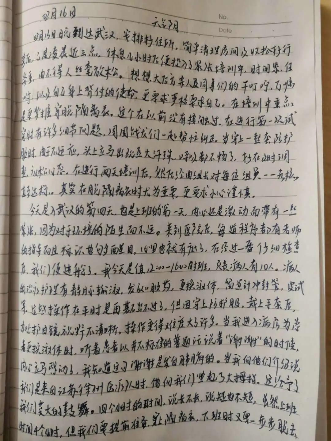 今天是入武漢的第四天,也是上班的第一天,內(nèi)心還是激動而帶有一絲緊張。因為對于環(huán)境的陌生而不適。來到醫(yī)院后,每道程序都有老師的指導(dǎo),而且標識也夠醒目,心里也就有底了,再經(jīng)過一番仔細檢查后,我們便進倉了。我今天是值12;00—到16:00班,負責(zé)病人有10人。病人的治療護理有靜脈輸液,發(fā)放口服藥,更換液體,留置針沖封管及皮試等,這些操作在平時是再基礎(chǔ)不過了,但因為穿上防護服戴上手套后,加上護目鏡視野不清晰,操作變得難度大了許多。當我進入病房為患者更換液體時,聽著患者以并不標準的普通話說著“謝謝”的時候,內(nèi)心立馬感動了。我知道這句謝謝是發(fā)自肺腑的,當我向他們介紹我們是來自江蘇徐州醫(yī)療隊時,他向我們豎起了大拇指,這給了我們莫大的鼓舞。四個小時的時間,說長不長,說短也不短,雖然上班時間四個小時,但我們要提前準備穿上隔離衣,下班時又要一步步脫去隔離衣,然后再回到住處,前前后后時間有八小時左右。一個班下來,感覺充實無比,出艙以后感覺耳朵痛的不能自已。耳根局部及面部都有深深的壓痕,護目鏡上霧珠早已模糊了整個視野。