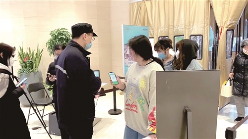3月9日上午9時30分許,在蘇寧廣場東門的員工通道前,一些員工出示“彭城碼”后直接進入通道大門,檢測體溫后就可以直接前往自己的崗位了。沒有注冊的員工,則在同事的幫助下現(xiàn)場注冊。