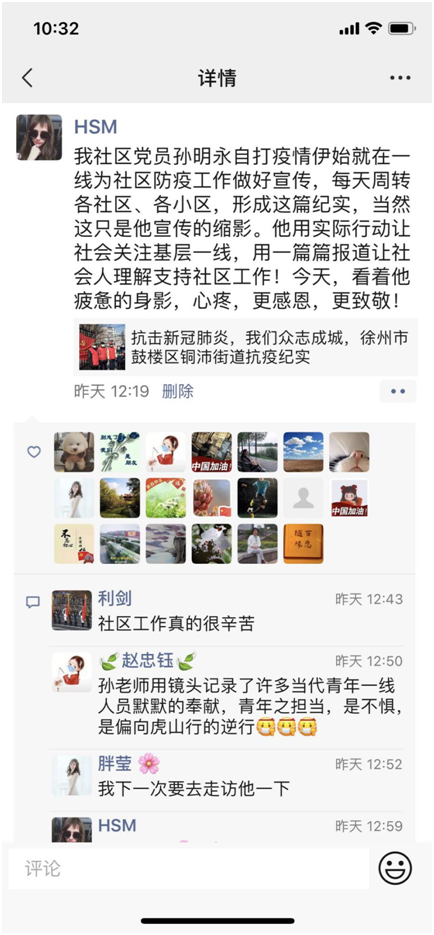 為了從各個方面反映社區(qū)工作人員和黨員志愿者全面抗疫的活動,孫明永采用多種形式介紹一線人員的先進事跡,利用現有的網絡媒體,如博客、微信、QQ等傳輸手段,媒體形式有微頭條、文章、視頻、抖音、視頻直播等形式,在多家媒體上發(fā)布,讓國內外觀眾都可以看到我們抗疫一線的真實情況,展現抗疫一線工作人員的正能量,弘揚社會主旋律,文章和微頭條70余篇,視頻近20個,獲得了社會廣泛好評。