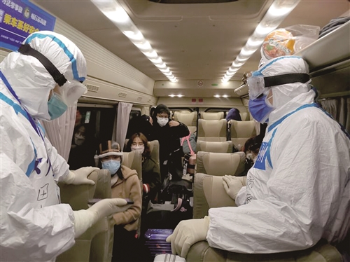 為了確保安全轉(zhuǎn)運(yùn),行車途中工作人員會時刻關(guān)注轉(zhuǎn)運(yùn)人員健康狀況,每兩小時對轉(zhuǎn)運(yùn)人員檢測一次體溫,及時將發(fā)熱、咳嗽等癥狀人員移送到應(yīng)急處置區(qū)域,出現(xiàn)情況嚴(yán)重者應(yīng)第一時間向工作組報告,協(xié)調(diào)落實(shí)就近就診。