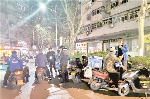 晚上9點(diǎn)多,外賣小哥在富國街路口候單。