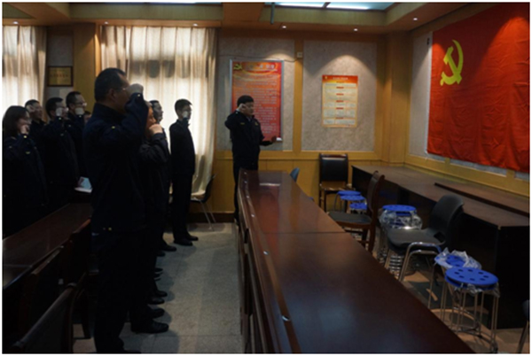 隨后,在黨支部書記的帶領(lǐng)下,全體黨員站在鮮艷的黨旗前,舉起右拳莊嚴宣讀入黨誓詞,鏗鏘的誓言表達了同志們對黨的忠誠和為共產(chǎn)主義事業(yè)奮斗終身的堅定信念。