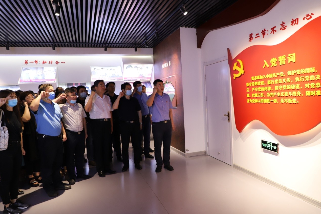在展廳現(xiàn)場,徐醫(yī)附院紀委書記談在祥同志帶領參觀同志們重溫入黨誓詞,面對黨旗,大家精神飽滿,莊嚴宣誓,響亮的誓言在展廳里回蕩。