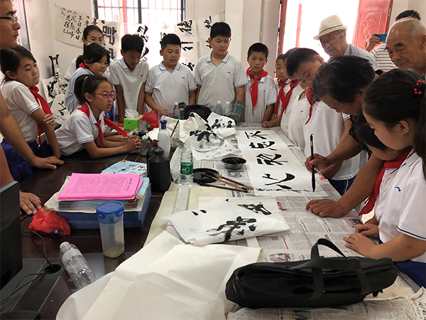 在慶“八一”書法交流活動中,張森、張立亮兩位書法家,對書法字體進行講解,并自愿揮毫潑墨,讓孩子們現(xiàn)場體會書法的藝術(shù)和魅力;張森還將現(xiàn)場書寫”惠風(fēng)和暢”作品,送給抗美援朝老軍人,最后和他們一起合影留念。